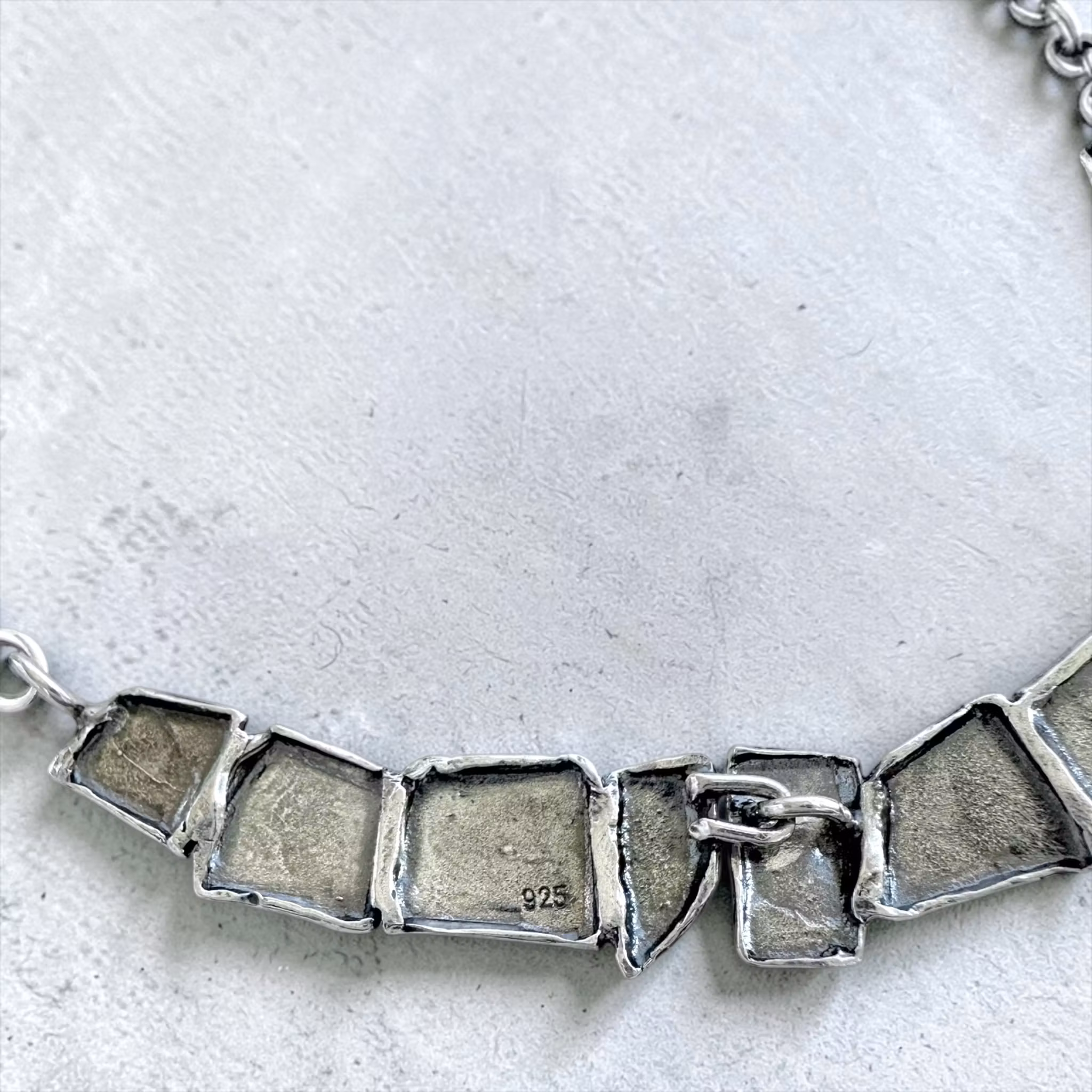 Ett mycket vackert och exklusivt halsband helt i silver. Begränsad upplaga. Halsbandet har utformats med flera ledade silverdelar i geometriska former och har en något rå ytstruktur. Snyggt, snyggt!