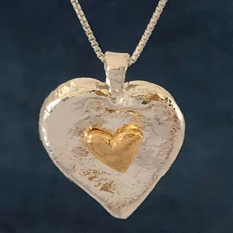 Silverhalsband med tanke och kärlek. Snyggt oregelbundet hänge med upphöjt, guldpläterat hjärta. Sista bilden visar baksidan på hänget. Se även våra matchande örhängen här
