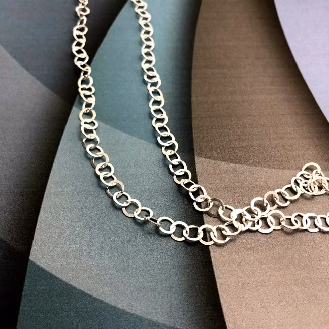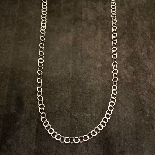 Snyggt silverhalsband med runda, platta länkar. Ganska nätt i sin utformning. Halsbandet är 60 cm långt och har en bredd på 5 mm. Låset är av typen karbinhake.