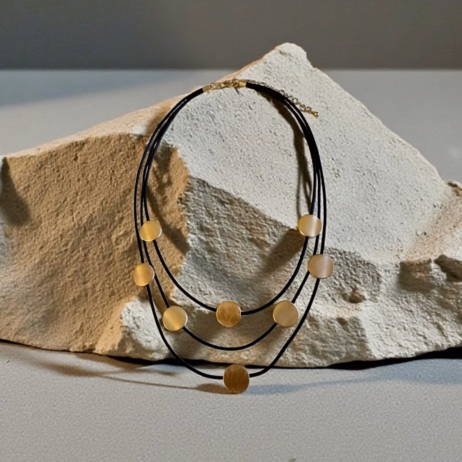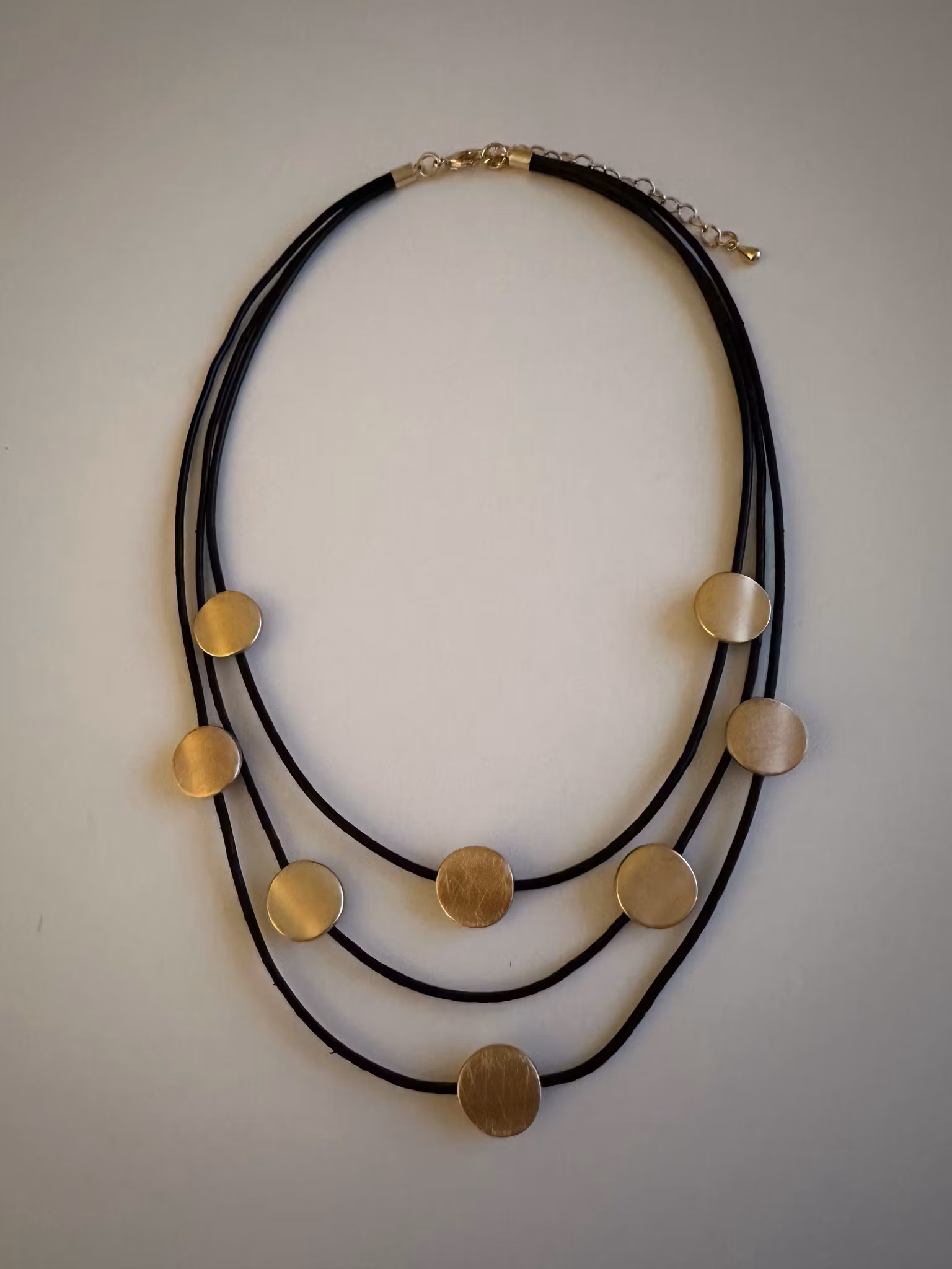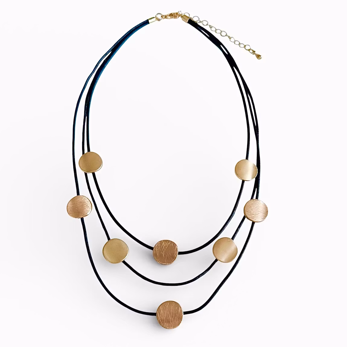 Från By Odahl. Snyggt halsband med guldplättar i nickelfri metall. Plättarna sitter på tre svarta läderband i olika längd. Karbinhakelås i nickelfri metall.