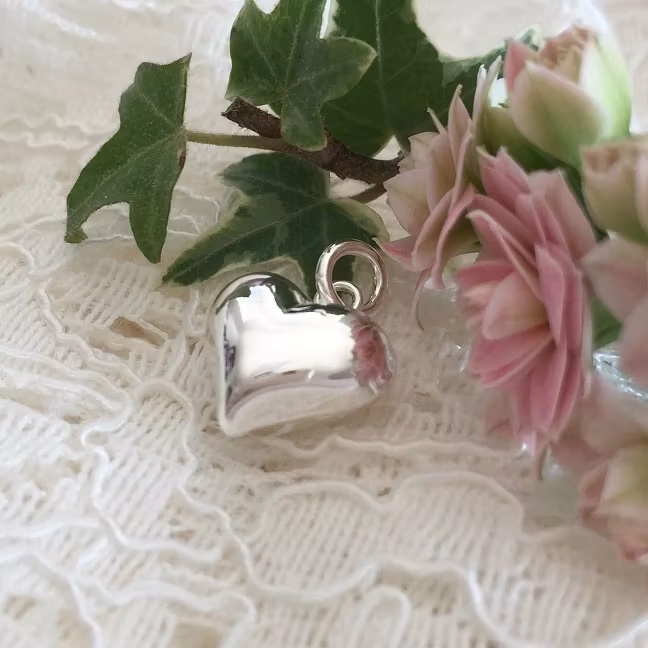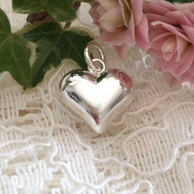 Litet fint klassiskt hänge med bulligt hjärta. Hänget är gjort i silver med slät, blank yta. Köp gärna till någon av våra silverkedjor. Vi rekommenderar Venecia eller Ormlänk. Det smala läderbandet (2 mm bredd) passar också fint.