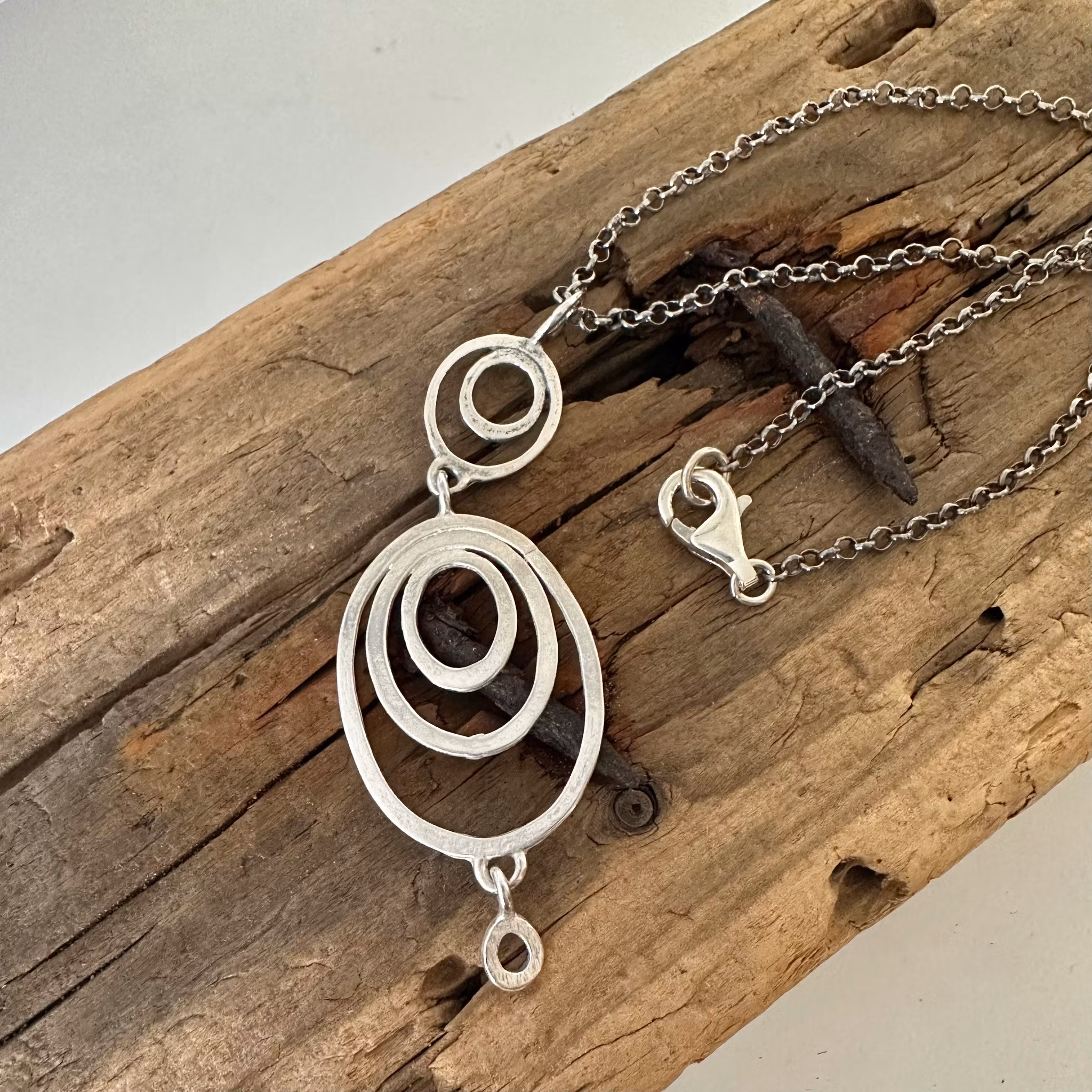 Minou, ett lite längre halsband i ruff, snygg design. Lätt oxidering på kedjan och en aning i hänget. Hänget är ledat i tre delar och har en kedja av typen ärtlänk.