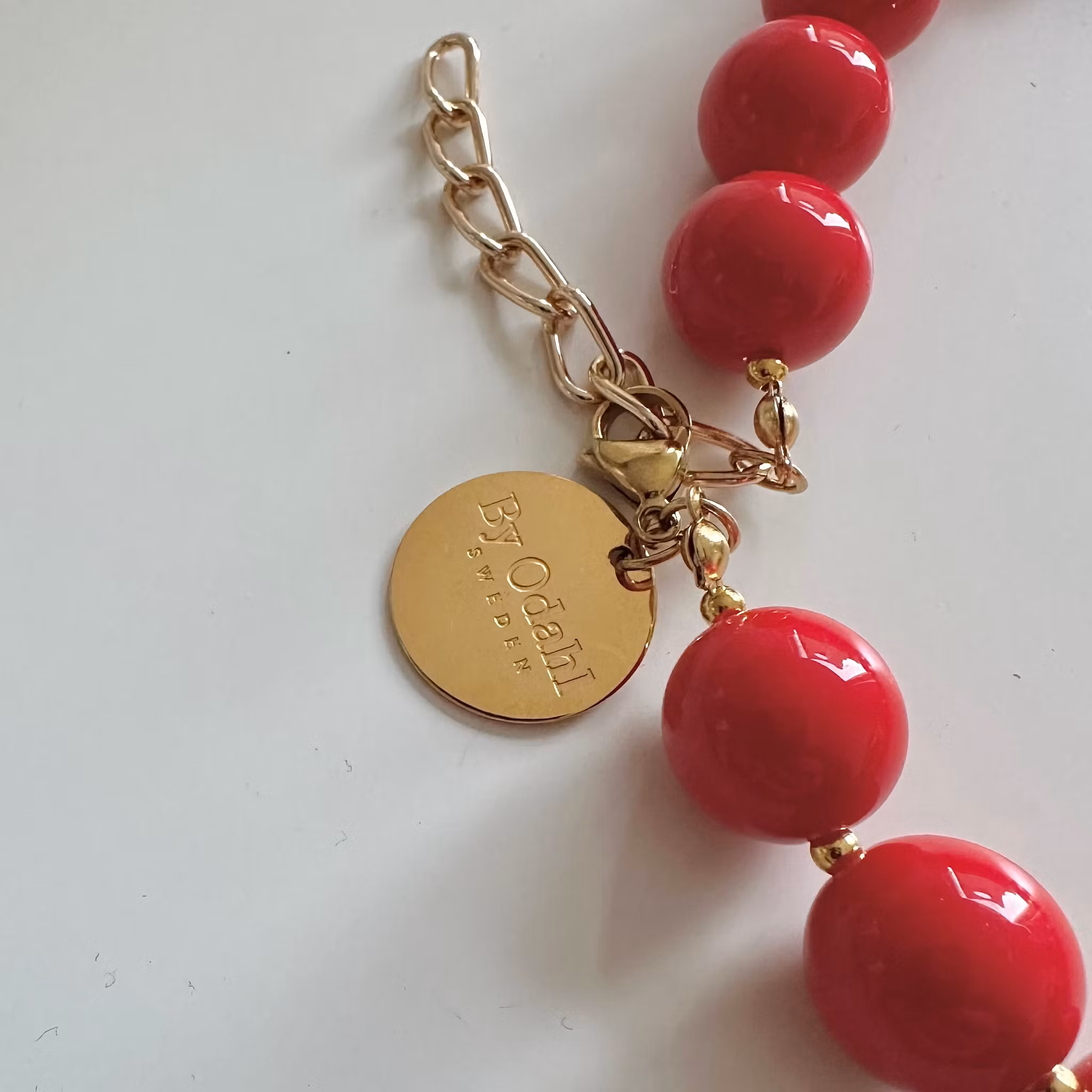 Rött fint kulhalsband från By Odahl I lager 289 kr Lägg i korgen Artikelnummer: H6-3 Fräscht och fint kulhalsband i rött från By Odahl. Guldfärgad nickelfri metall. Karbinhakelås. Halsbandet är 50 cm långt och har en förlängningskedja på 6 cm.