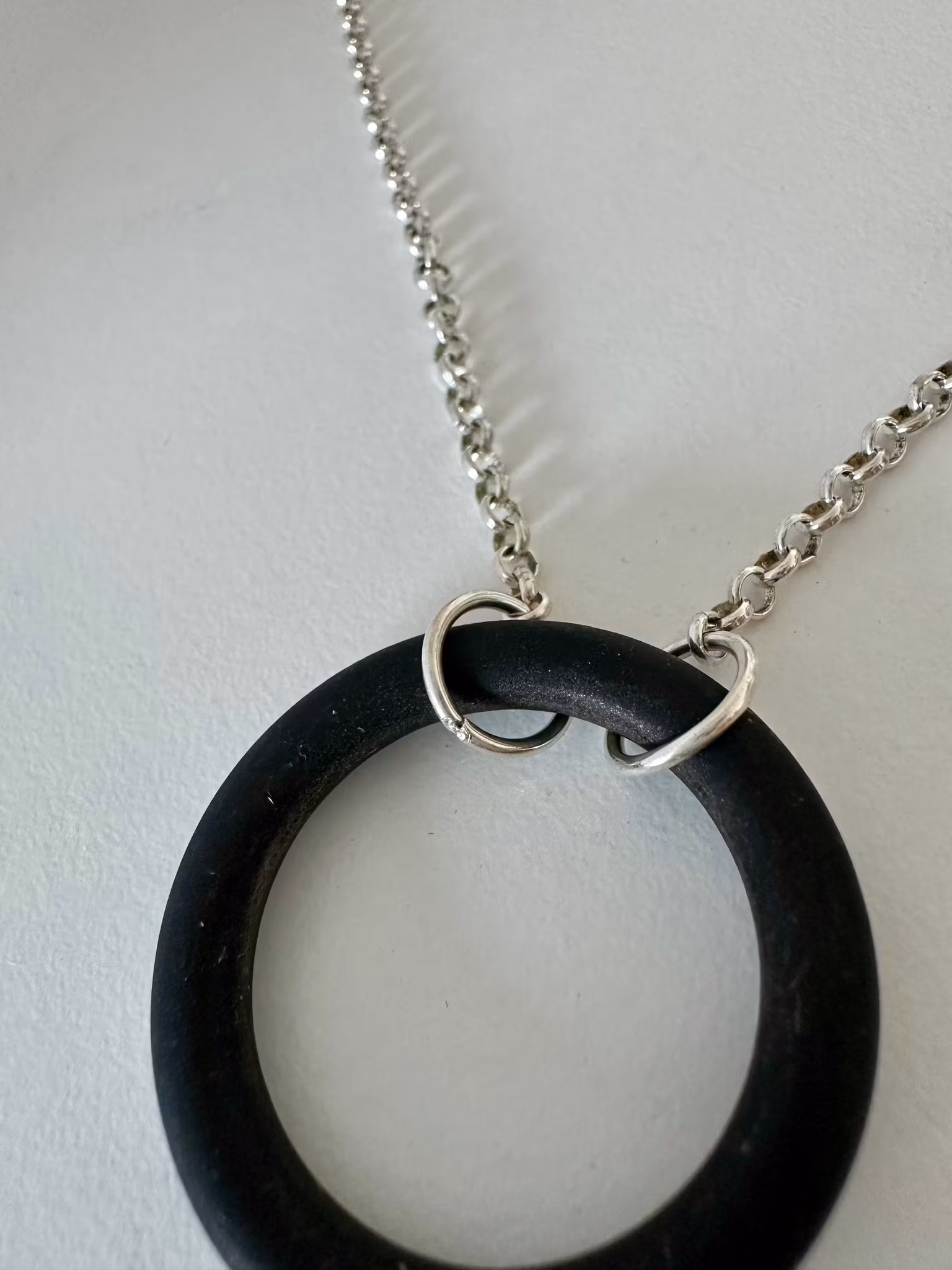 Fint halsband med hänge i form av mattsvart glasring. Kedjan är en rejäl ärtlänk med 3 mm bredd. Allt i äkta silver förutom den lilla kuben på kedjan, som är silverpläterad.