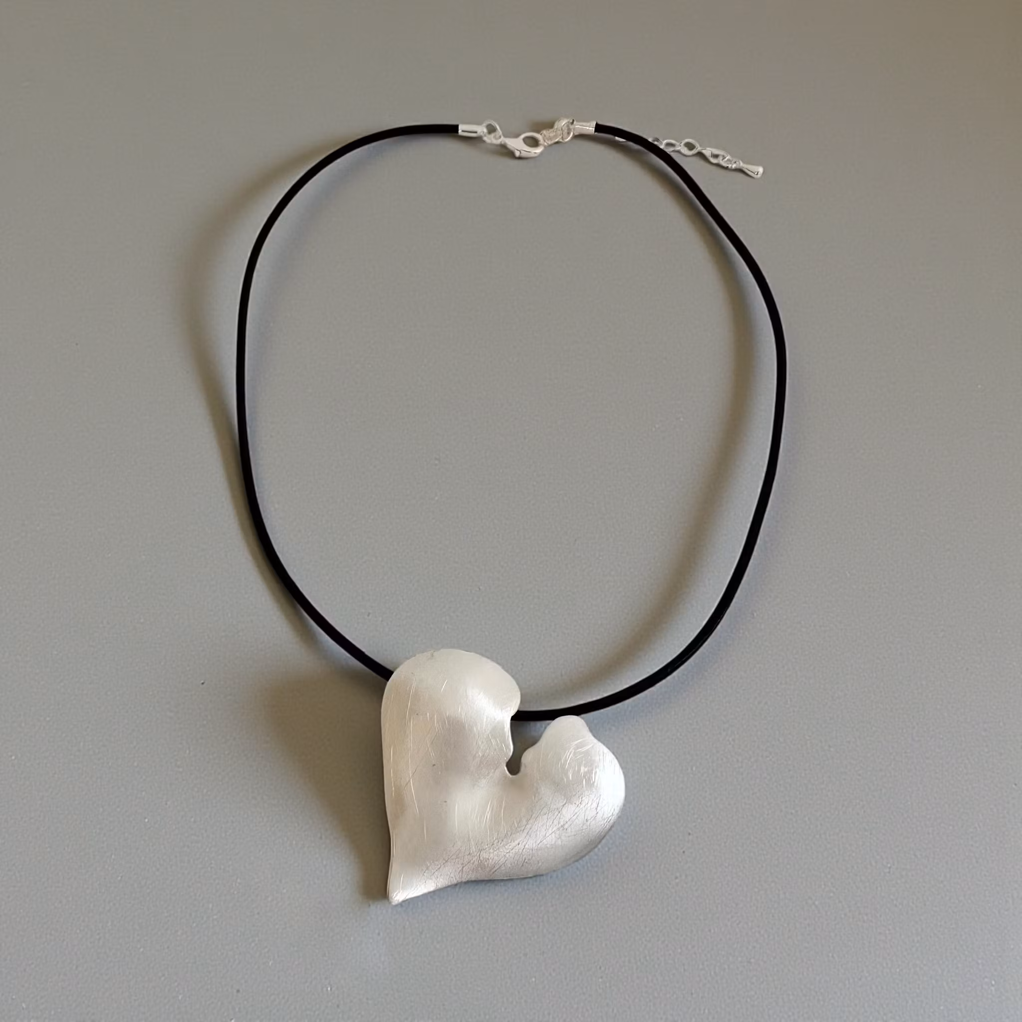 Stort silverhjärta på läderband I lager 298 kr Lägg i korgen Artikelnummer: H26-2 Fint silverfärgat halsband från By Odahl. Stort hjärta med bredd 5 cm i lätt borstad, nickelfri metall. Svart läderband på 47 cm med förlängningskedja 7 cm. Lås i form av karbinhake.