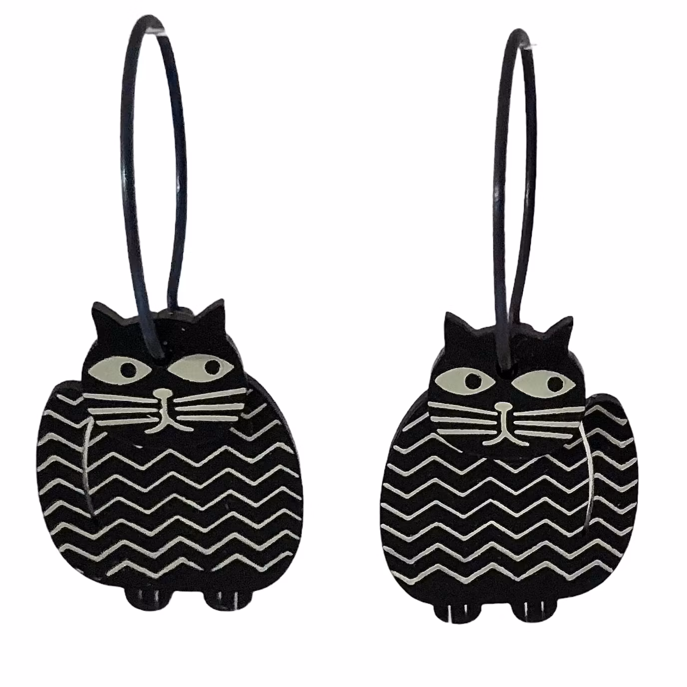 Svensk design från K-form. Härliga små katter med glimten i ögat gjorda i plexiglas. Katterna är svarta med sicksackränder. Creoler i titan, som är en mycket bra och allergivänlig metall.