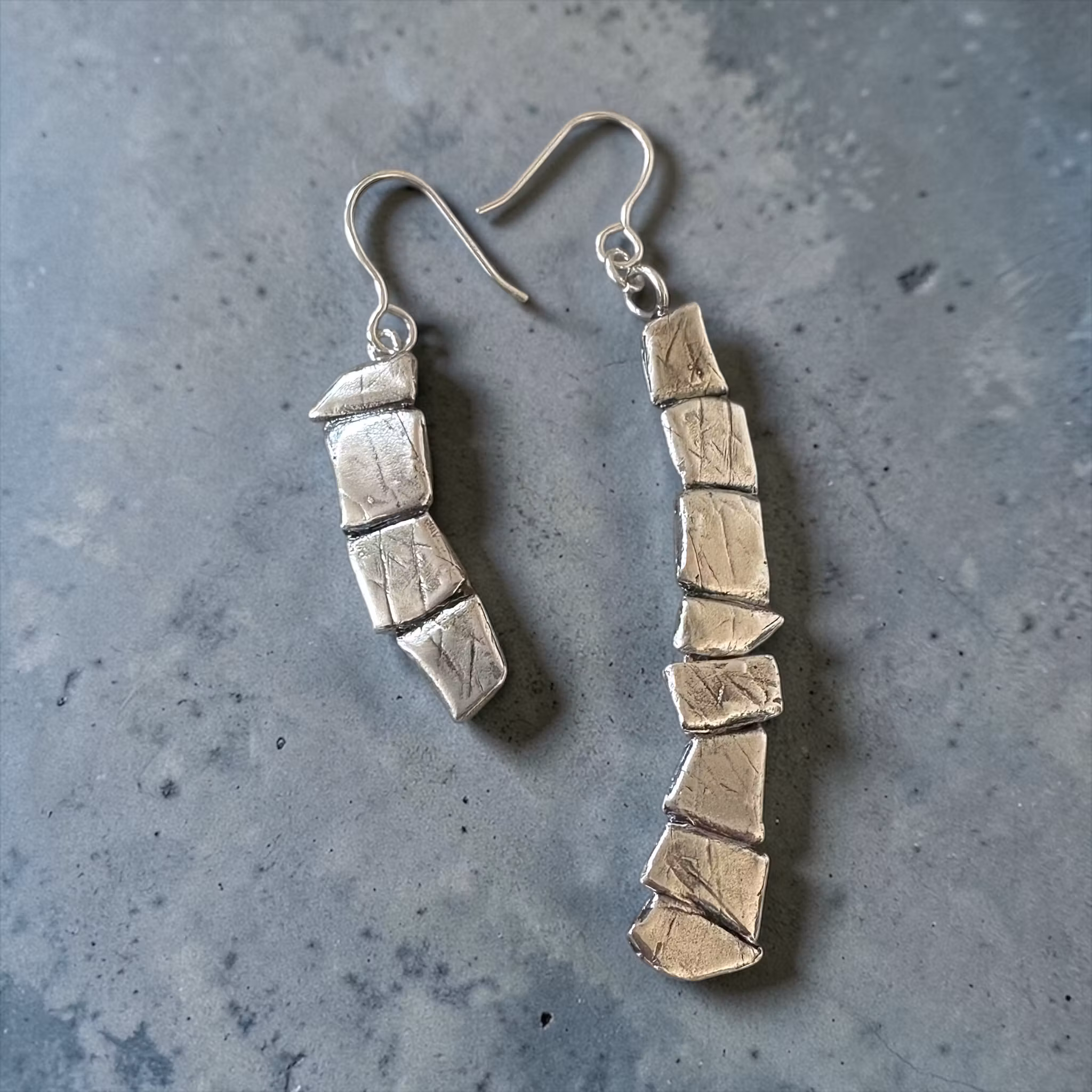 Snygga och speciella örhängen helt i silver. Begränsad upplaga. Örhängena har utformats med flera ledade silverdelar i geometriska former och har en något rå ytstruktur.