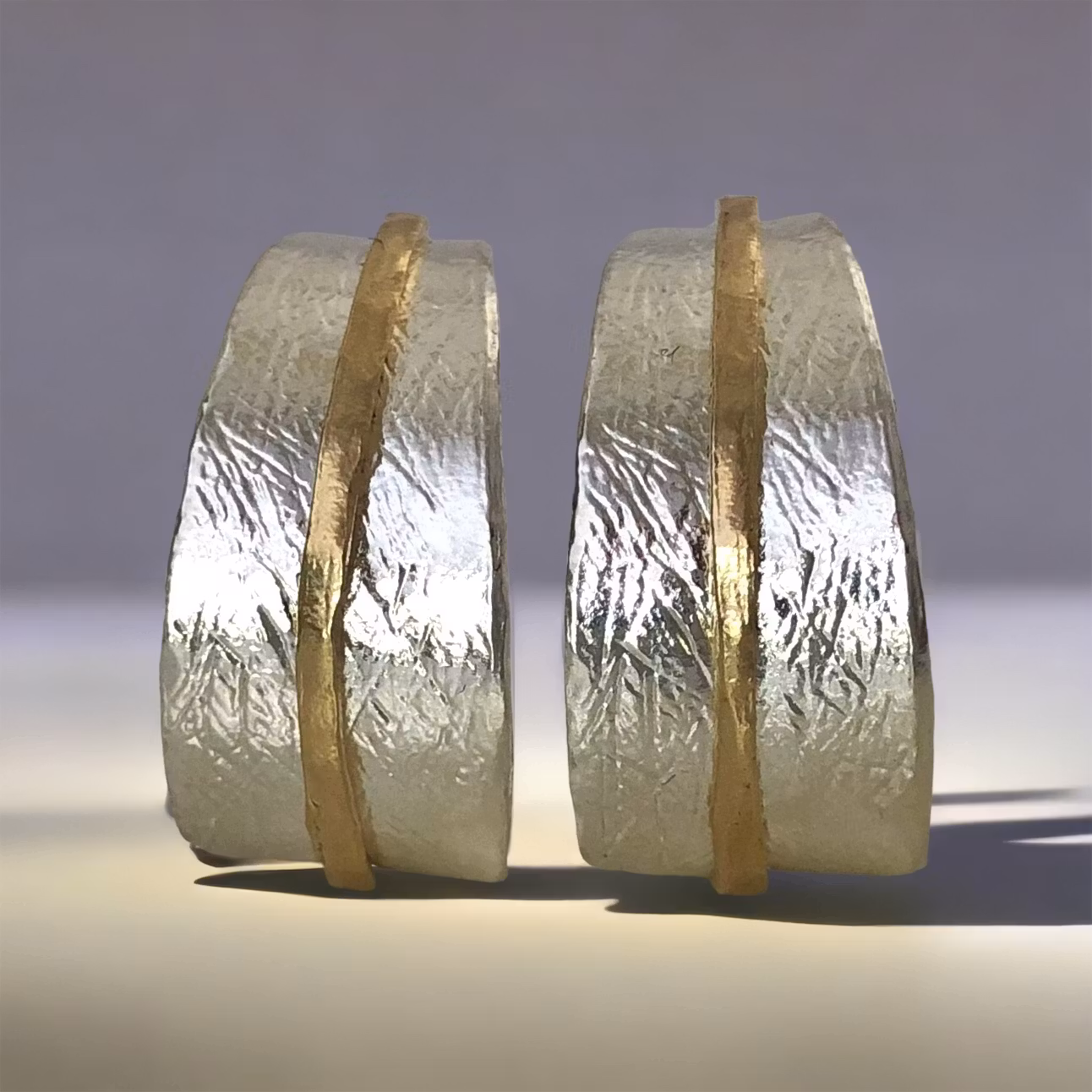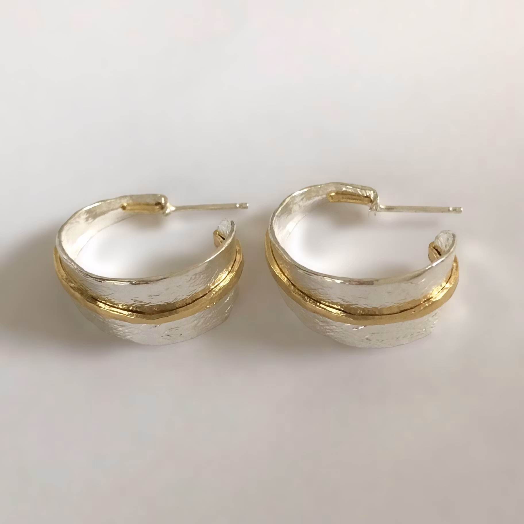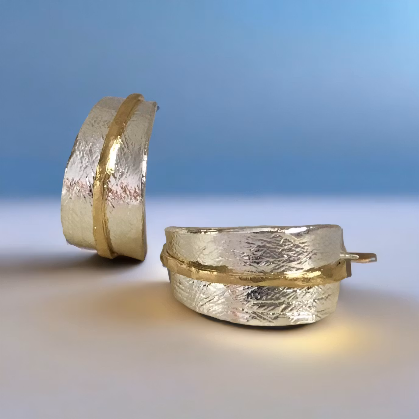 Dessa creolörhängen i silver är något extra och vääldigt snygga. Ytan har en grövre textur och är lätt oxiderad, en liten, liten aning mörkare än på fotona. Smalt guldpläterat band löper längs med örhänget.