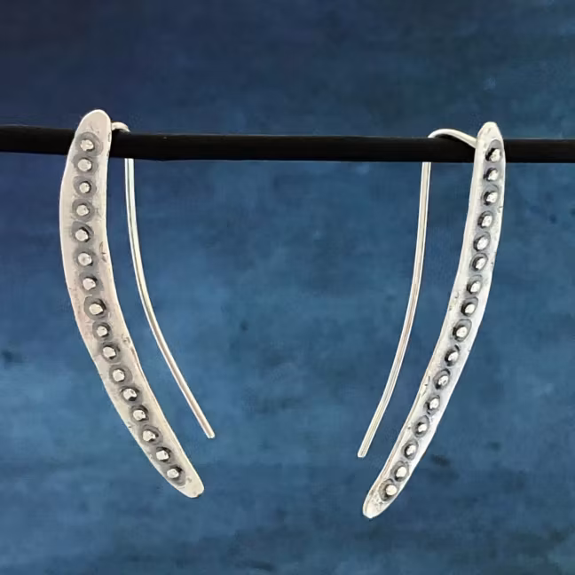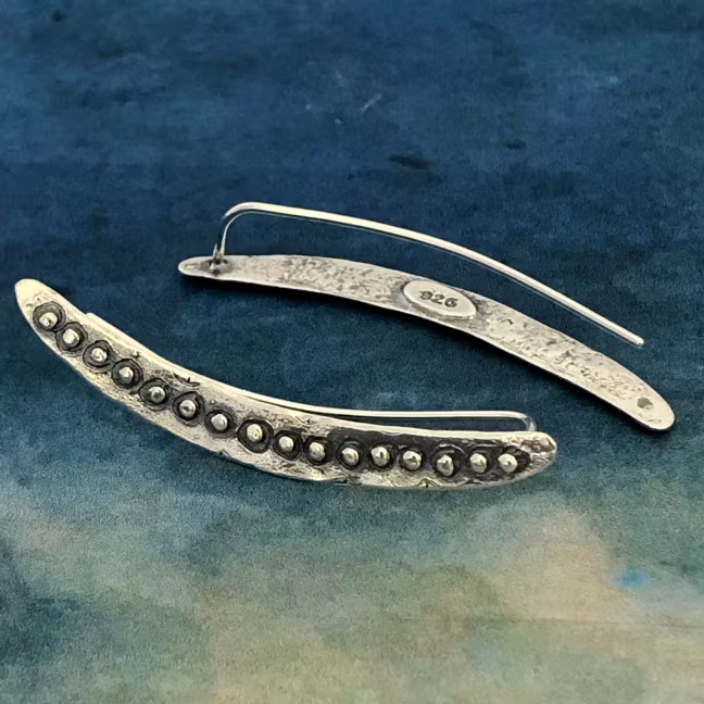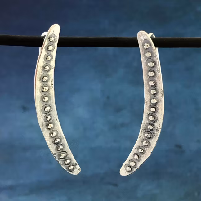 Bridget - Snygga lätt oxiderade örhängen 279 kr Just nu är varan slut i lager Artikelnummer: AE19077 Mycket snygga örhängen i oxiderat silver. Lätt böjd form med upphöjda prickar. Långa öronkrokar.Längd: ca 4,5 cmBredd: ca 5 mm