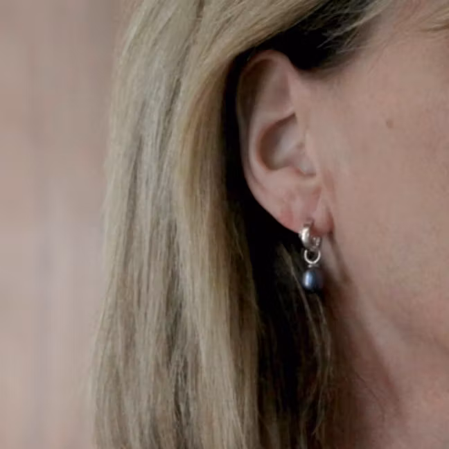 Stilrena silverörhängen i bra kvalitet. Peacockfärgade, ovala sötvattenpärlor och silvercreoler. Pärlorna är ca 1 cm långa.