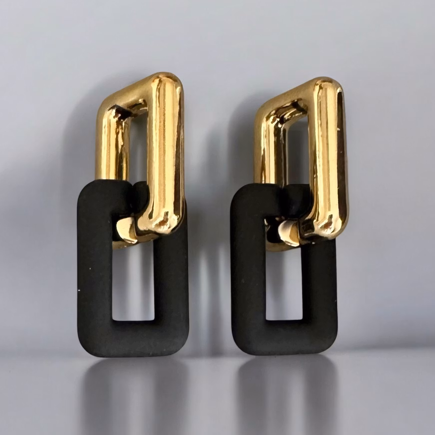 Örhängen i svart/guldfärg 169 kr Just nu är varan slut i lager Artikelnummer: Ö12-1 Festliga snygga örhängen från By Odahl Sweden. Två fyrkantslänkar i akryl. Örhängena har stift och ploppar i metall/plast. Allt är nickelfritt.Längd: ca 4,5 cmBredd: ca 2 cm