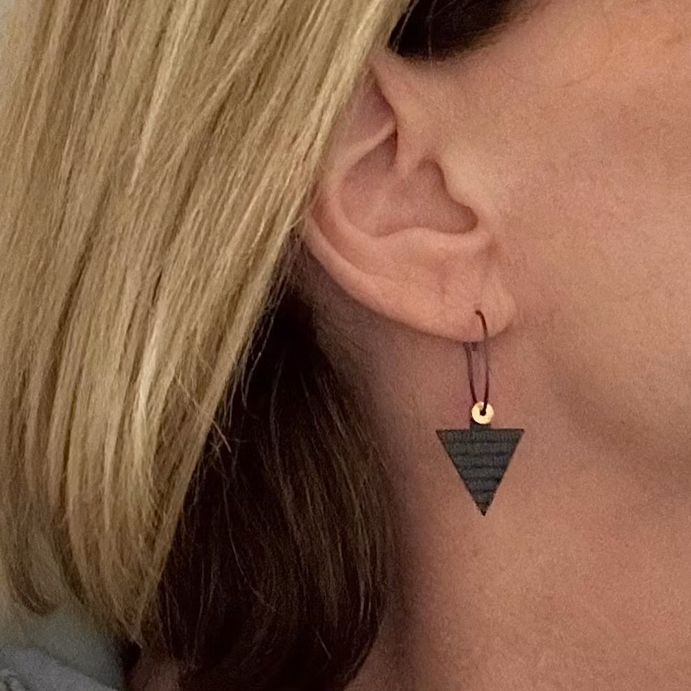 Örhängen i snygg design från K-Form Sverige. Svart med gråa och guldfärgade detaljer. Örhängena är gjorda i plexiglas och har creoler i titan, som är en mkt bra och allergivänlig metall.
