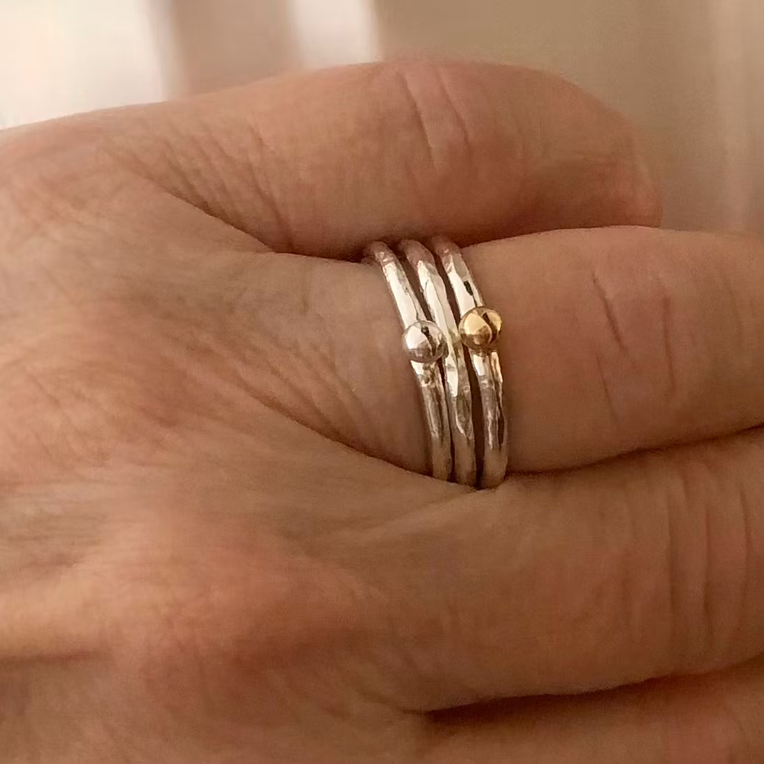 Vacker smal silverring med guldkula. Hela kulan är gjord i 9 karats guld. Ytan på ringen är blank och lätt oregelbunden.
