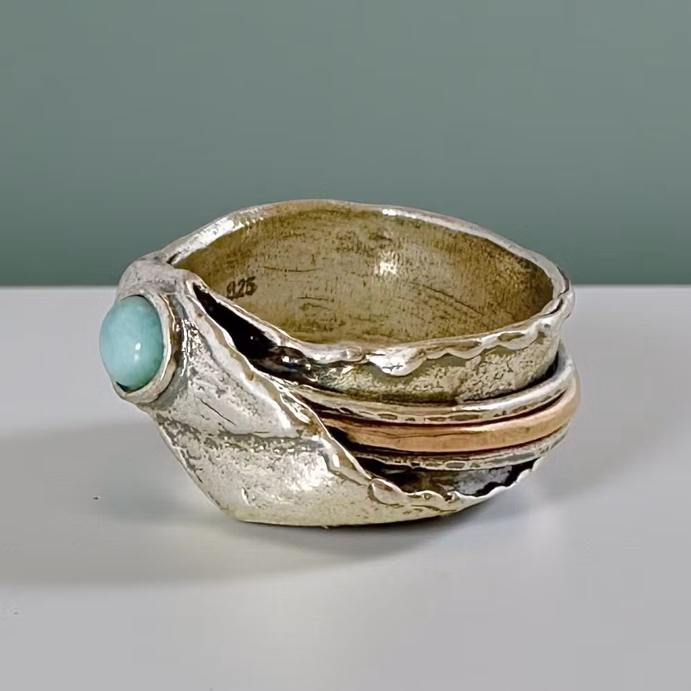 Denna snygga ring finns bara i ett exemplar hos oss. Helt i silver med en touch av rustik design. Det är en spinningring som har tre smala ringar i mitten som går att snurra på. En av dessa ringar är så kallad guldfylld, dvs har en kärna av mässing med ett överdrag av äkta guld (tjockare än vid guldplätering) Ringen har även en fin ljusblå kvartssten.