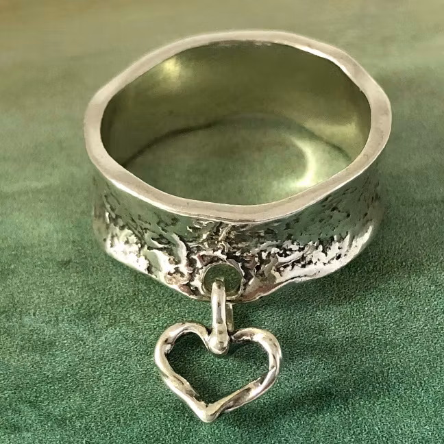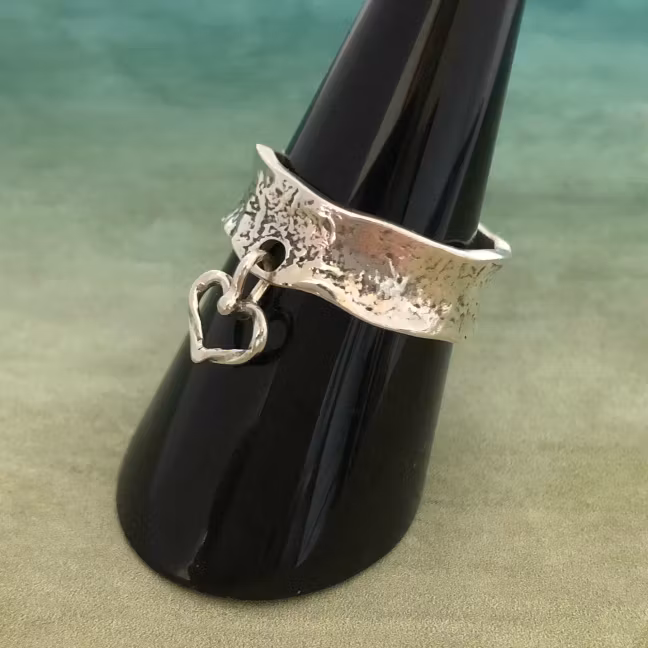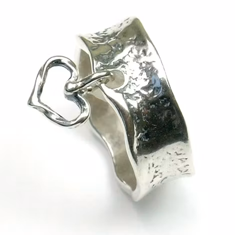 En mycket snygg ring i silver med rörligt vidhängande litet hjärta. Ytan är en aning rå och lätt oxiderad.